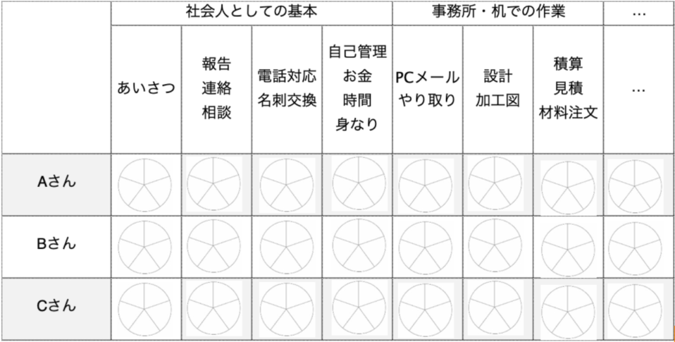 最初に項目を揃えるところが少し手間ですが、それさえ乗り切れば、半年に1回や1年に1回の個別面談の場で見直し「半年前よりも今、今よりも半年後」と言った具合にレベルアップを感じられる道具となるはず。人材育成や採用について対策をする第一歩の道具としてお勧めすることが多いです。