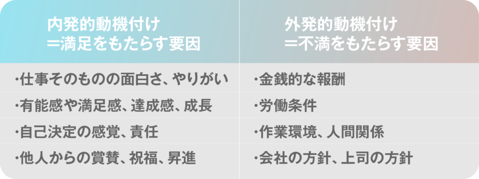 上の表の通り、内発的動機付けは満足をもたらす要因、外発的動機付けは不満をもたらす要因と言われています。多くの場合、「社員が定着しない!」という悩みについて話す時は右側の外発的動機付けの内容に目がいってしまうのですが、左側の内発的動機付けにいても目を向ける必要があります。