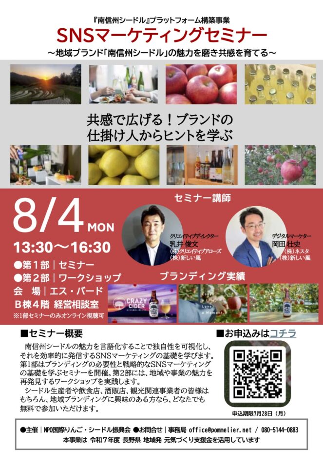 来る8月4日(月)、同会が取り組む『南信州シードル』プラットフォーム構築事業の一環として、SNSを活用したデジタル発信の基礎を学ぶ公開型セミナーが開催されます。