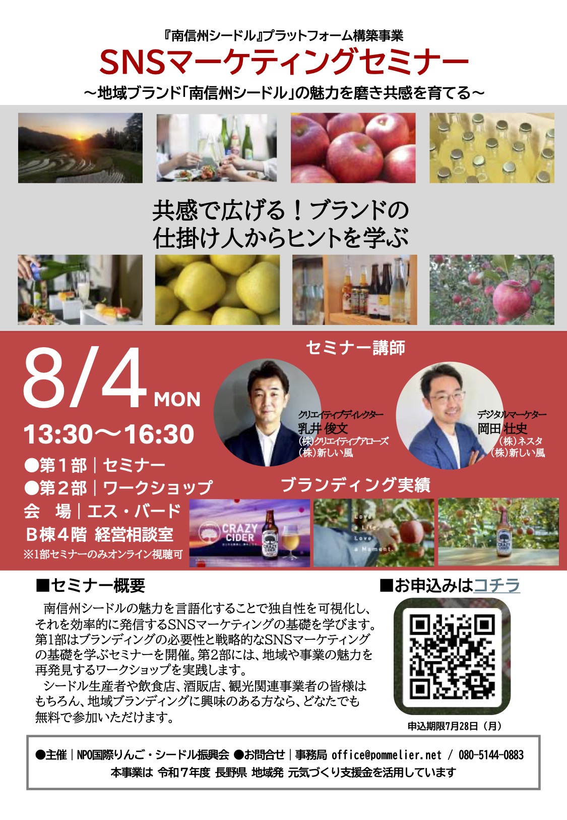 セミナーは2部構成。青森県平川市発のクラフトシードルブランド「CRAZY CIDER/クレイジーサイダー」の立ち上げにて全方位的なブランディング支援の実績をもつ乳井俊文さんと岡田壮史さんを講師に迎え、「ブランディングの必要性と戦略的なSNSマーケティングの基礎」を学ぶ第1部と、地域や事業の魅力を再発見する実践型のワークショップの第2部を実施予定です。