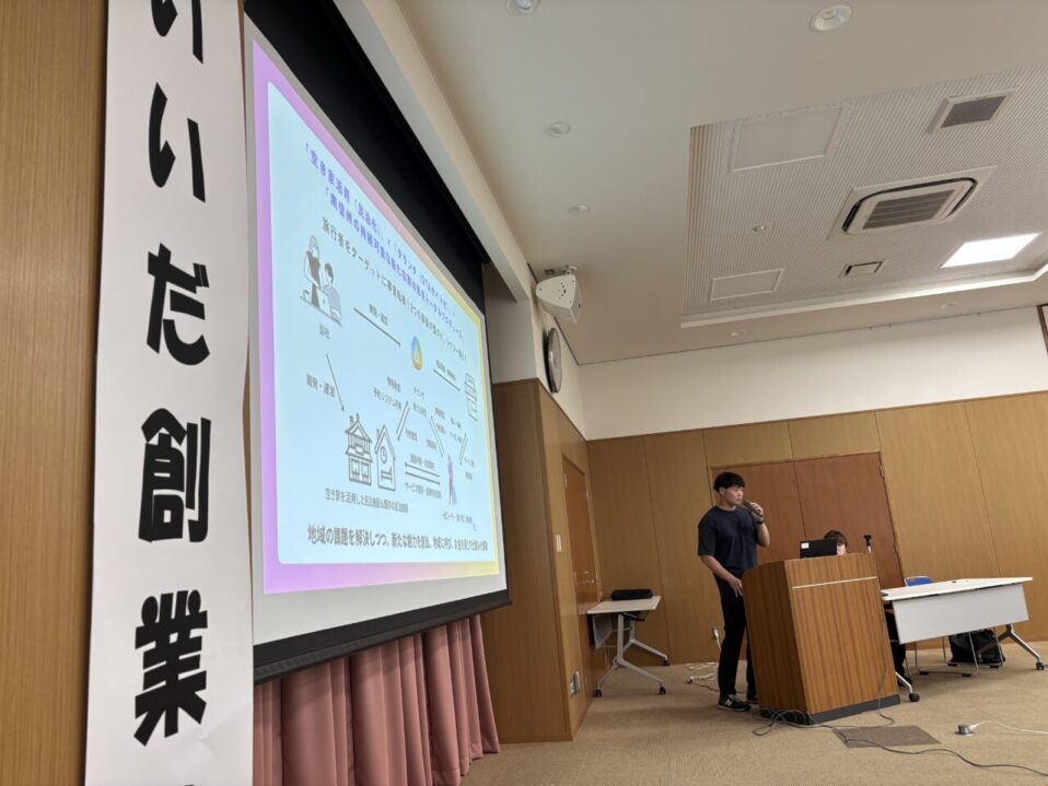 今回、登壇したのはビジコン受賞者の2名。それぞれ7分間という限られた時間の中で、ビジネスアイデアに込めた想いや現在抱える課題、今後の展望などを語りました。限られた持ち時間の中で、自らの言葉でまっすぐに語る先輩起業家の姿に、会場からは熱い視線が注がれていました。