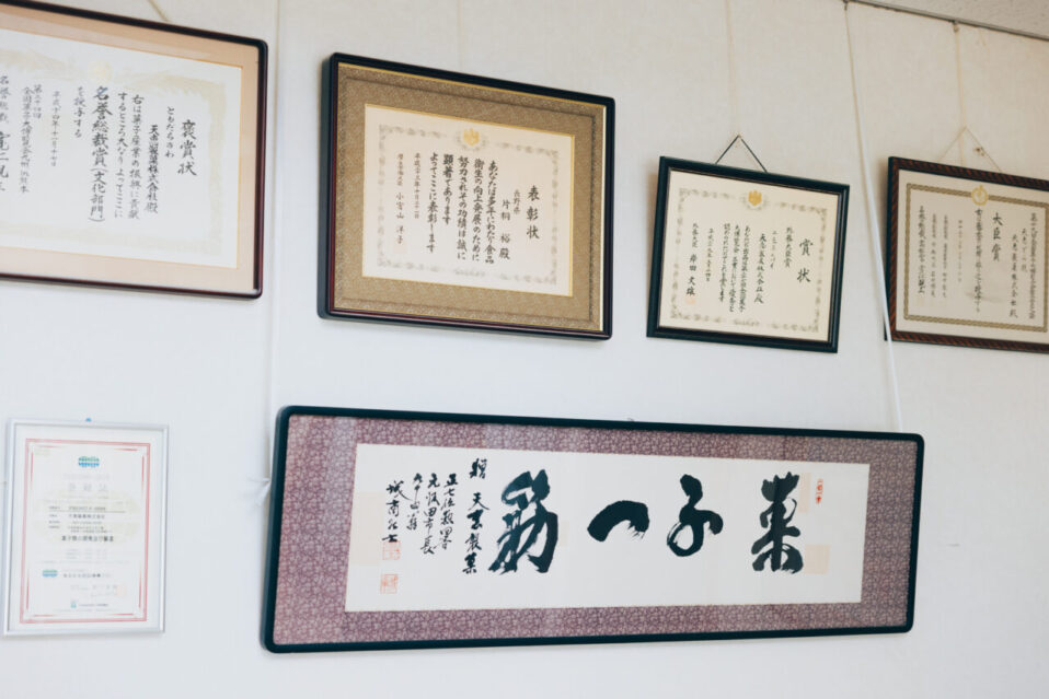 天恵製菓社内に掲げられた「菓子一筋」の書と、数々の表彰状。なお、同社の社是は「愛」だという