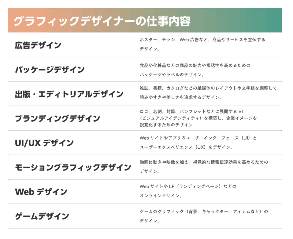 グラフィックデザイナーの仕事内容を大分すると、以下のように分けられます。