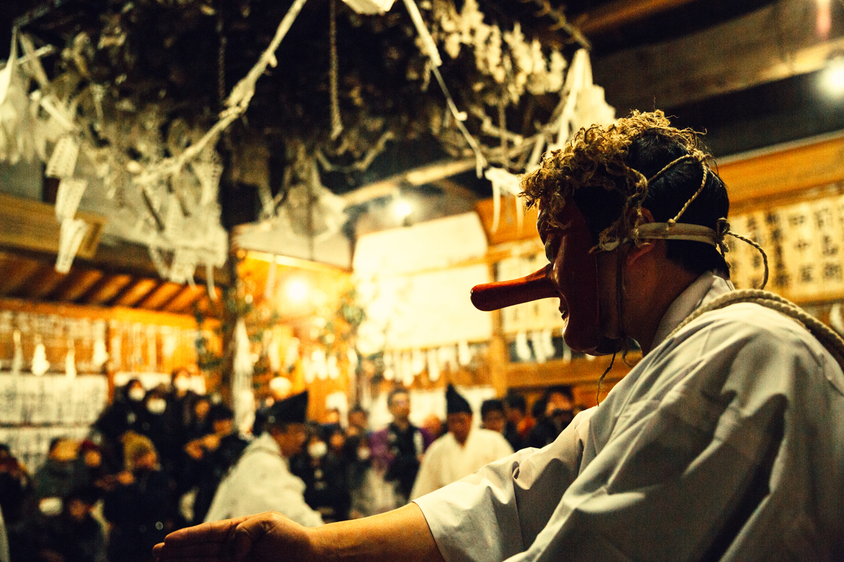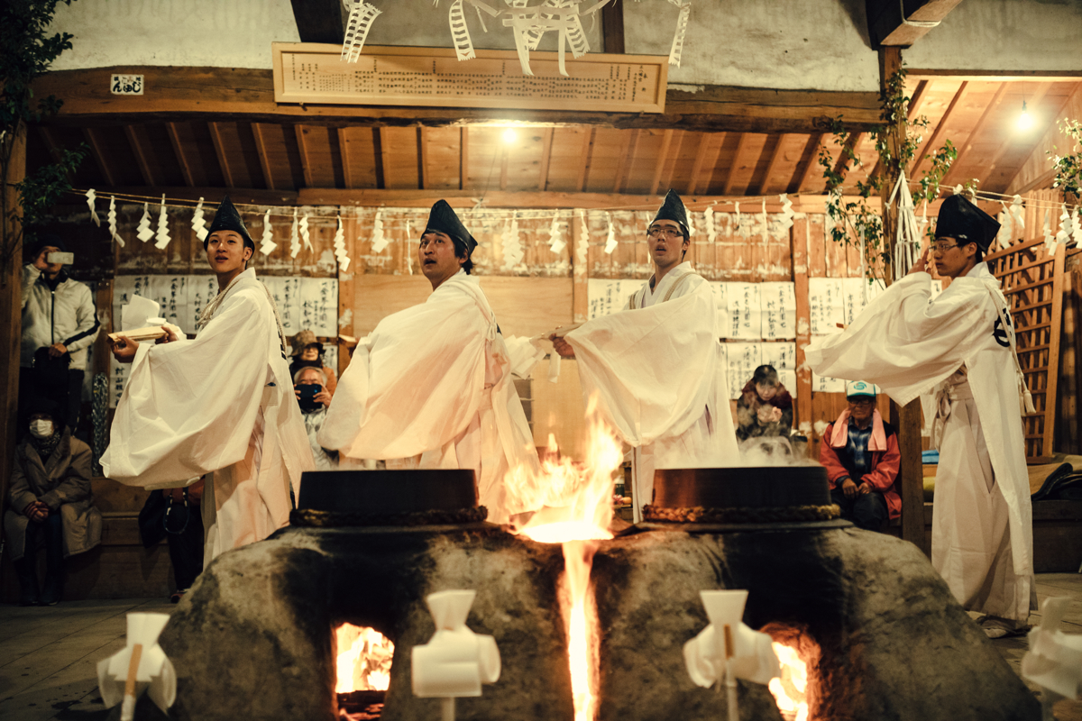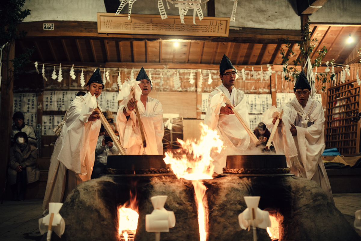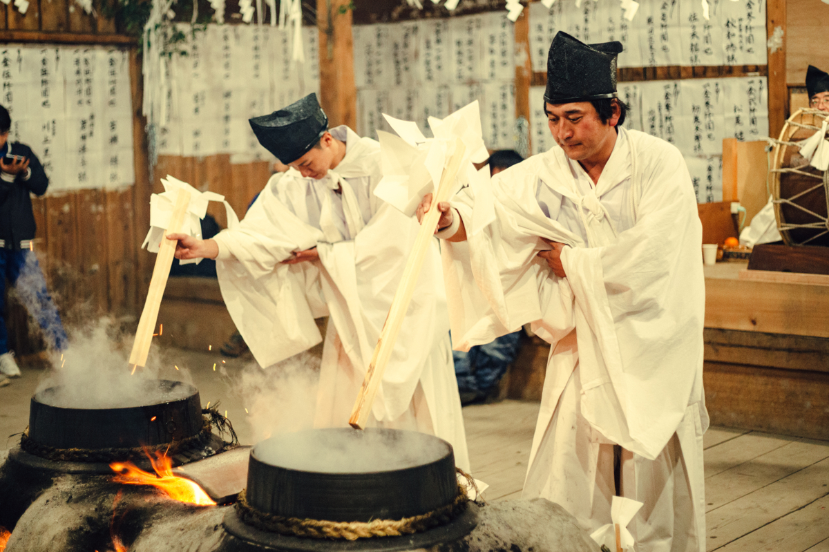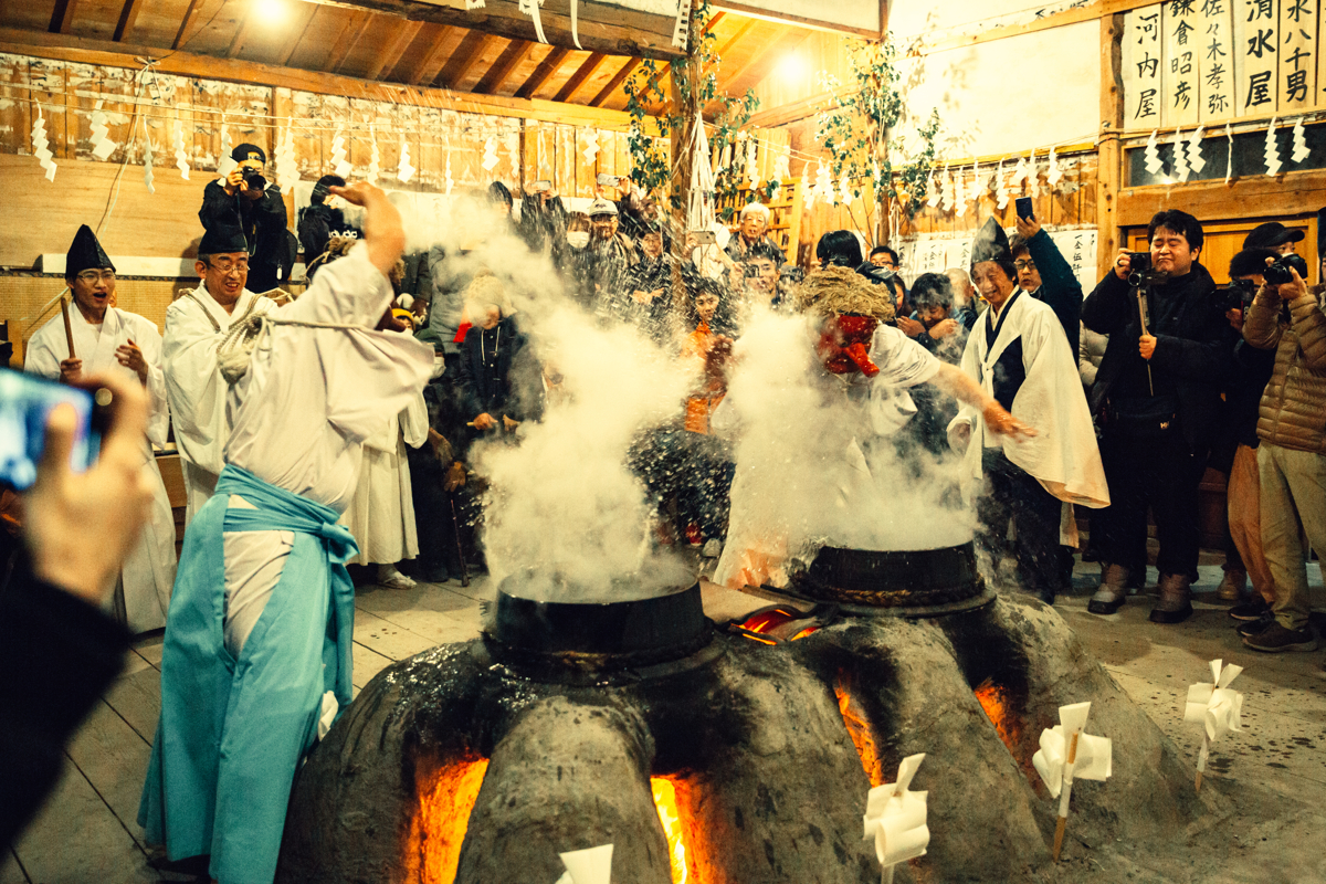 祭りでは社殿の中央に据えられた釜の上には神座が飾られ、湯を煮えたぎらせ神々に捧げます。見どころは、祭りのクライマックスになると天狗などの面が登場し煮えたぎる湯を素手で“はねかる”、「湯切り」。このときふりかけられた禊の湯によって、一年の邪悪を祓い新しい魂をもらい新年を迎えるといわれています。初めて参加される方は是非この禊の湯を浴びていただきたいものです。