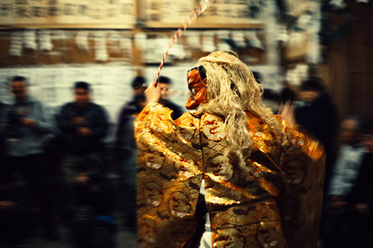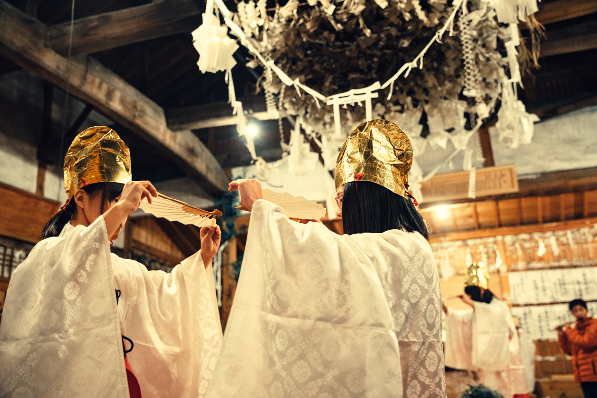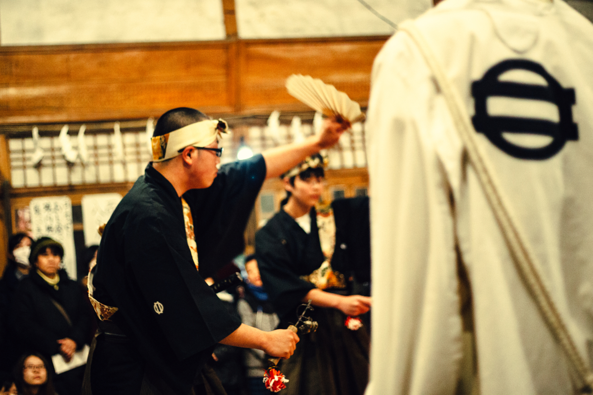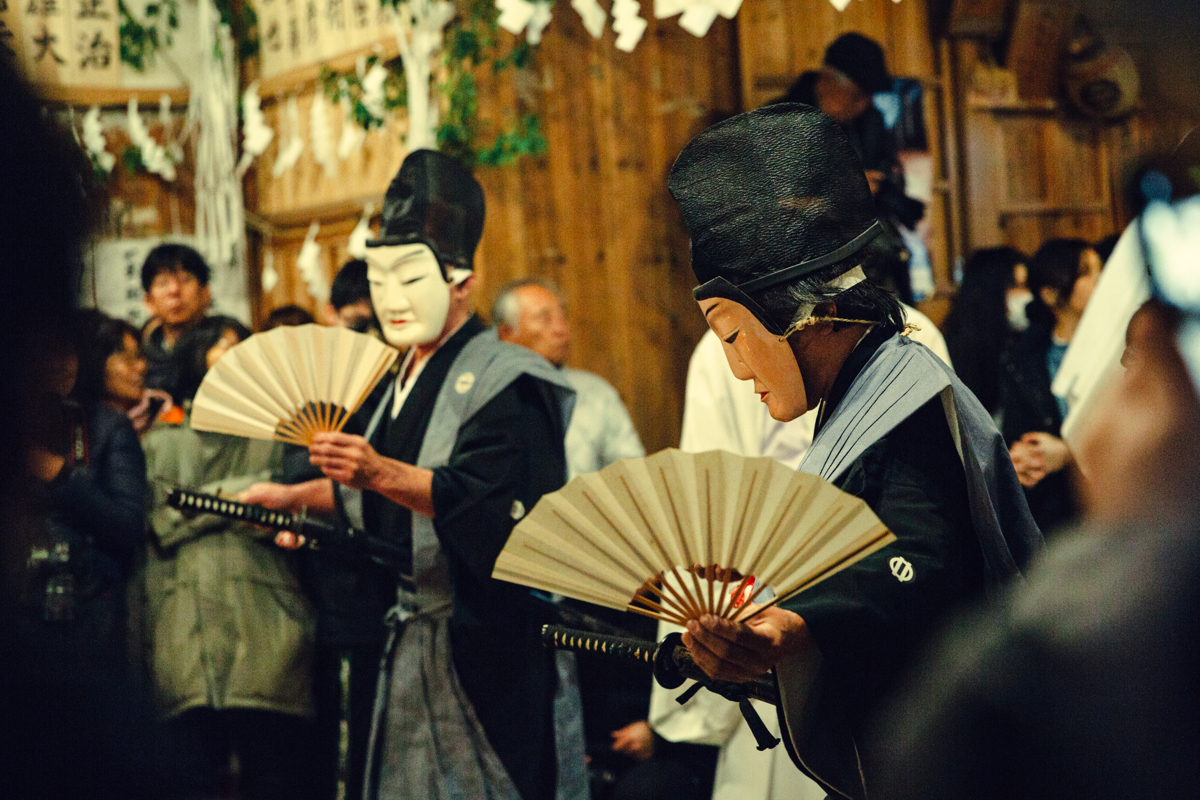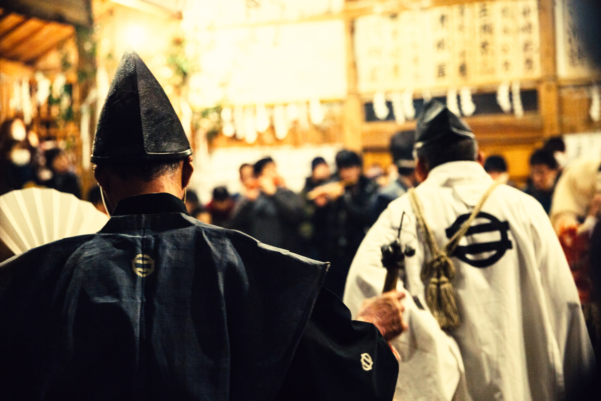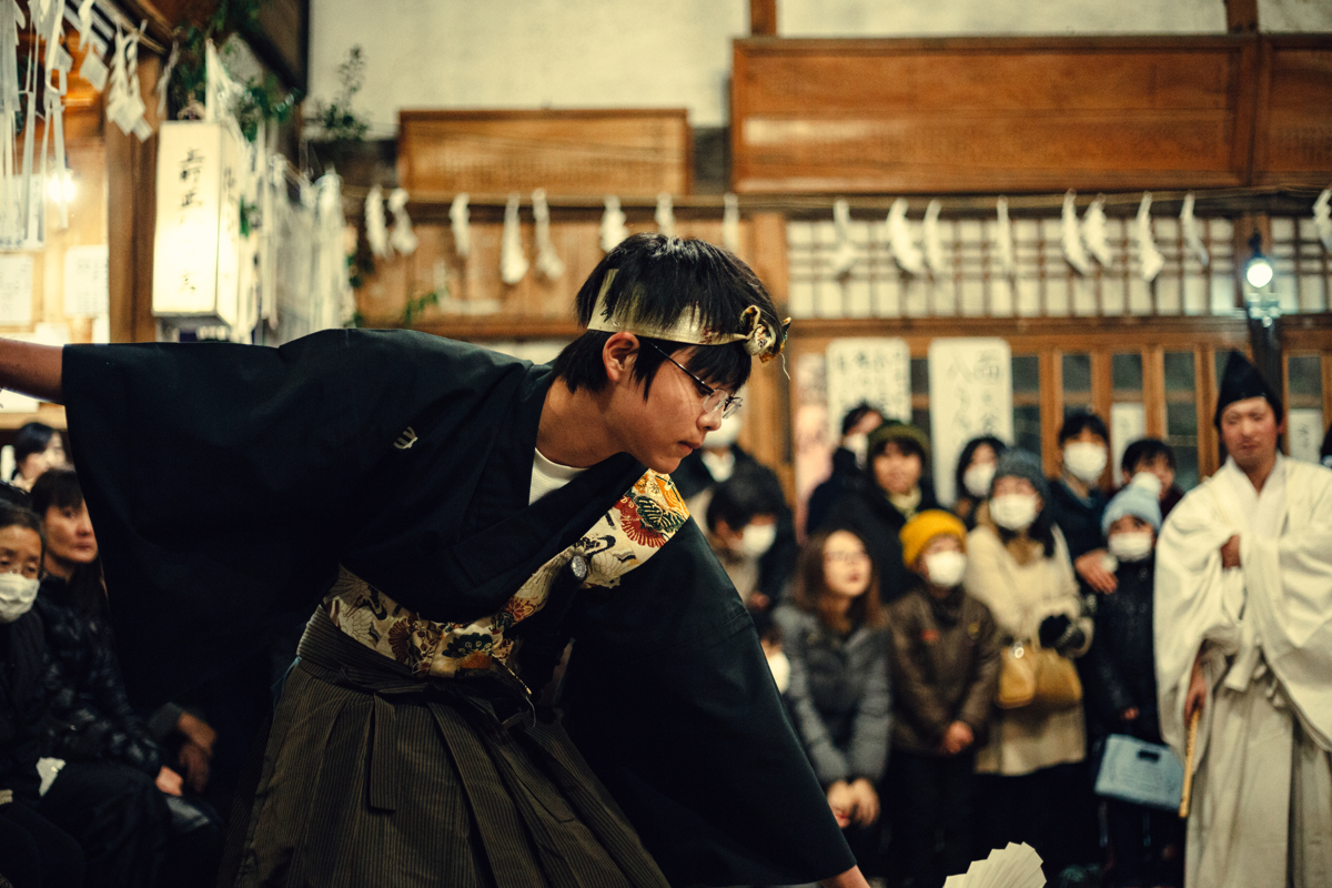 祭りでは社殿の中央に据えられた釜の上には神座が飾られ、湯を煮えたぎらせ神々に捧げます。見どころは、祭りのクライマックスになると天狗などの面が登場し煮えたぎる湯を素手で“はねかる”、「湯切り」。このときふりかけられた禊の湯によって、一年の邪悪を祓い新しい魂をもらい新年を迎えるといわれています。初めて参加される方は是非この禊の湯を浴びていただきたいものです。