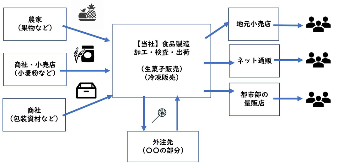 販売先・仕入先を考える時に整理しやすい方法として「商流」を描いてみることをお勧めしています。「商流」とは商売の流れを図にしたもので、ビジネスモデル図ということもあります。たとえば菓子製造を行う会社の一般的な商流図を描くと次のような感じになります。