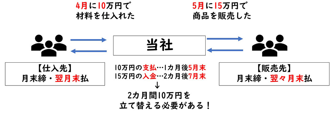 次の図は、材料を10万円で仕入れて、加工し、商品を15万円で販売する会社のお金の流れになります。仕入先は月末締翌月末払(ある月に収めた材料は一括し翌月末期限で請求されるという意味)、販売先は月末締翌々月払(ある月に受け取った商品は一括して翌々月末期限で代金を支払うという意味)だったとすると、仕入から販売までに1カ月の差が生じた場合、トータルで2カ月間も仕入代金10万円を立て替える必要が生じます。