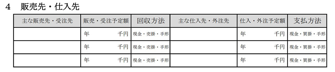 販売先・仕入先に書く方々の名前は、言ってみれば商売を続けるにあたって「お取引先さま」になる方々です。商売をしていると「お取引先さま」の影響はとても大きく、とくに新しい事業を始める場合はしっかりと考えておく、あるいは事前に取引条件などを約束(交渉)しておくことが大切になるため、こういった計画書でも記載を求められます。