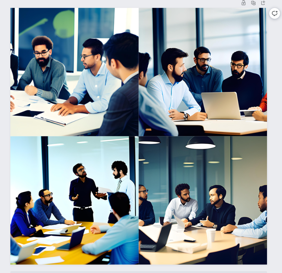 とは言え使い方は驚くほど簡単で、「IT企業の会議室でクリエイティブな意見を出し合うエンジニアとデザイナー」という文章からこれだけの画像が生成されるのだから画像生成AIの進化は驚異的なスピードで進んでいると言っていいでしょう。