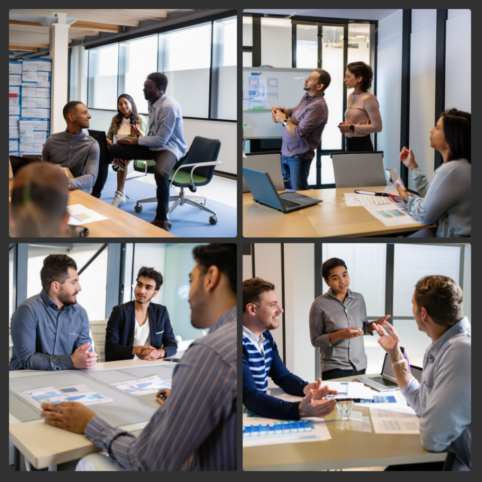 命令文:IT企業の会議室でクリエイティブな意見を出し合うエンジニアとデザイナー