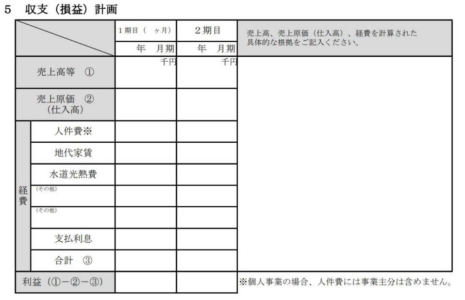 収支計画の様式をみると、大きく左側と右側に分けることができます。左側は予想売上高や予想経費などの数字を記入する欄、右側はその数字の根拠を記入する欄になっています。