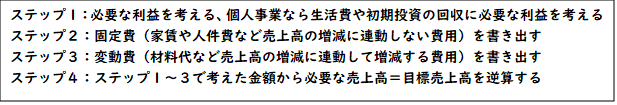 このように、一次方程式に数字を入れ込んで計算してもらっても良いですし、いろんなパターンを根気よく逆算してもらっても大丈夫です。とにかく目標利益を確保するために必要な売上高=目標売上高がおおよそ何円くらいなのかを把握していることが大切になります。この数字を全く把握せずに事業を始めることは、成り行きで大切な思いの詰まった事業を行うようなものであり、正直なところおススメできません。