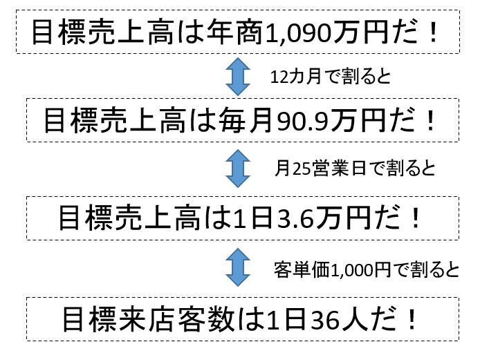 先ほどのパン屋さんの例を用いると、次のように計算できます。年間売上高1,090万円と言われてもピンときませんが、1日の目標売上高が36,000円とか、来店客数が36人と言われるとグッとイメージできるようになりますよね。