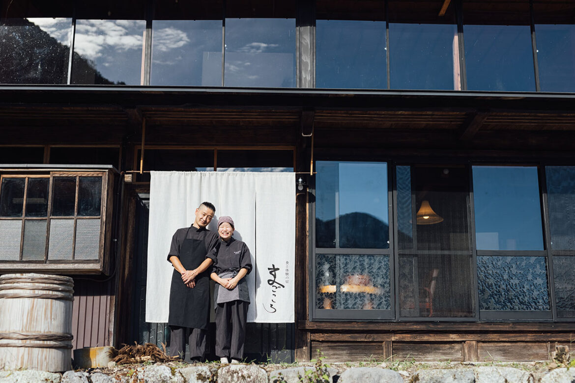 長野県飯田市のなかでも山間部に位置する上村地域。「遠山郷」の呼称で知られるこの地に2022年10月、築150年の古民家を改装した「食と体験の宿『まごころ』」が誕生した。経営するのは数々の和食の名店で修行を重ねてきたオーナーシェフの小池清志さんと、地域おこし協力隊として移住した小池真沙美さん夫妻。同店は宿だけでなく、ランチにディナー、宴会も実施可能な「新島(あたらじま)食堂」としての顔も持つほか、ケータリング事業も好調だ。