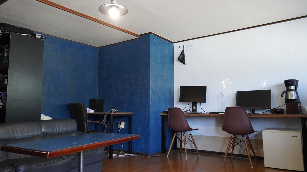 部屋は2024年1月現在1室のみ利用可能。少し手狭ですが、設備面では、モニター6台、A3プリンター、ウォーターサーバー、コーヒーマシンが完備されており、旅先での利用には十分な設備を提供しています。