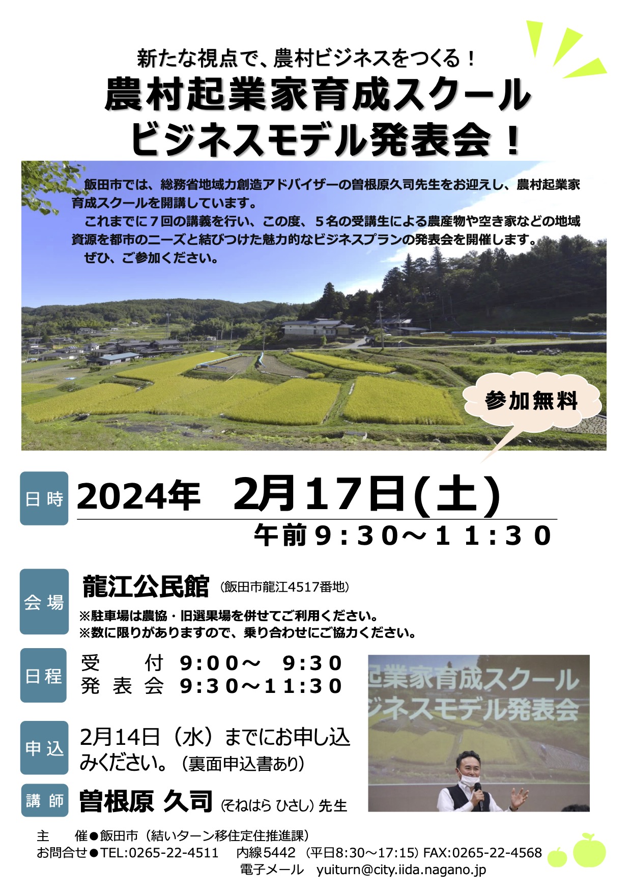 地域資源と都市のニーズを結んだ新しいビジネスの構築を目的とした「飯田市農村起業家育成スクール」の受講生によるビジネスモデル発表会が、2月17日(土曜日)、龍江公民館(飯田市龍江)で開催されます。