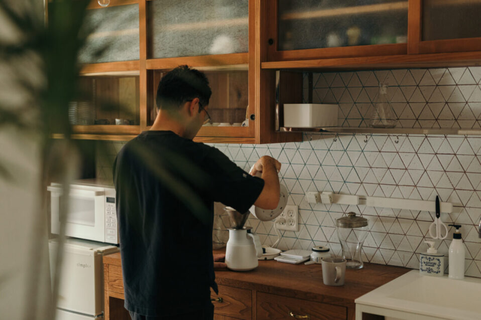 デスクから本棚を挟んで反対側には、これまたアンティーク調で統一されたおしゃれなキッチンを完備。毎日持ってくるのが大変な大き目の荷物を保管したり、ご飯の簡単な温めなど問題なく行えるのも嬉しいところです。