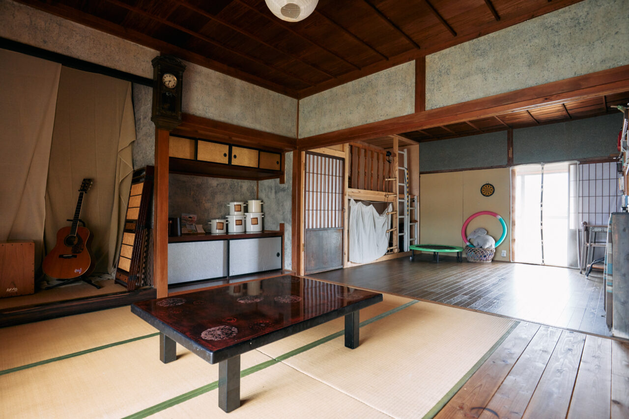 豊さんが少しずつDIYを進めている、宿泊客用のプライベートスペース。奥の部屋は畳だったが、一面をフローリングに替えている。押し入れは子どもが遊べる秘密基地に。