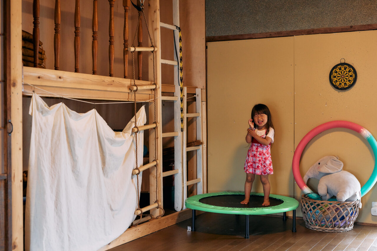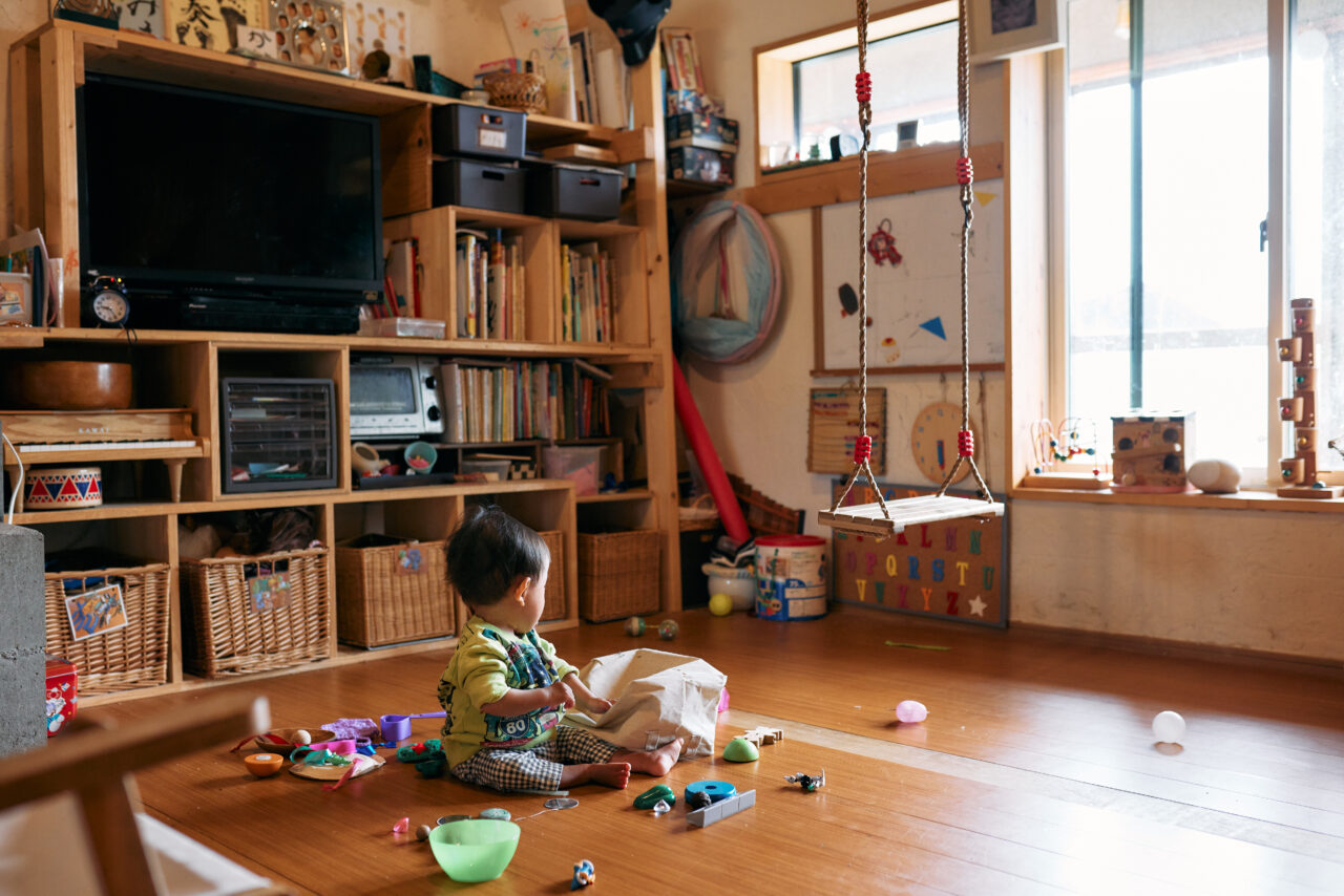 おもちゃがたくさん揃っているwaratte houseは、子どもたちにとってパラダイスのような空間。リビングの一角にはブランコも。