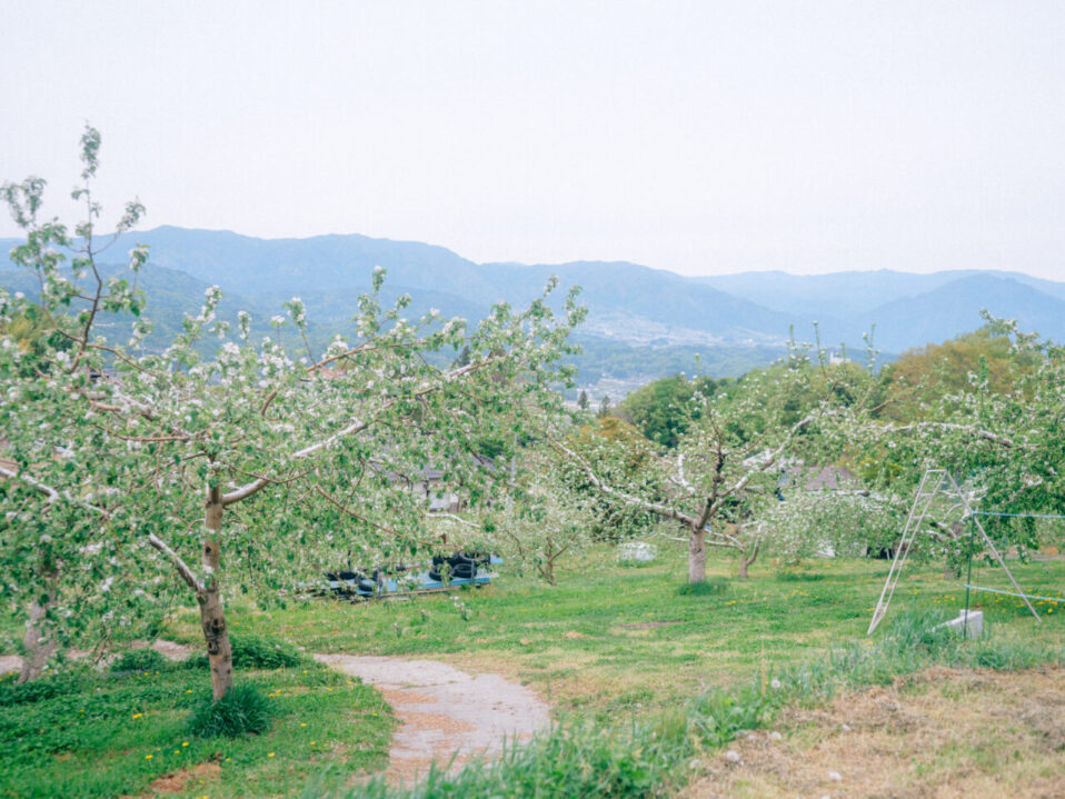 りんごの花が咲き、その木々の向こうには飯田の町並みがと中央アルプスを見渡せる丘にある「たつみ農園」におじゃましたのは、4月の終わり。