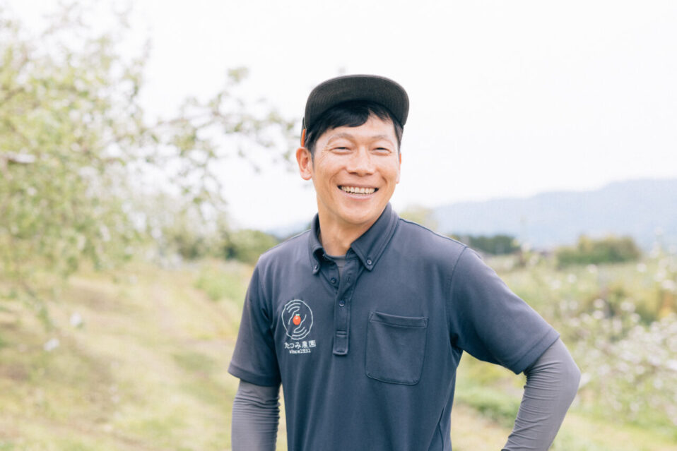 飯田市・天龍峡エリアでりんごや桃、ぶどうなどを栽培する果樹農家であり、観光農園としても多くのファンを持つ「たつみ農園」を経営する松尾明則さんです。