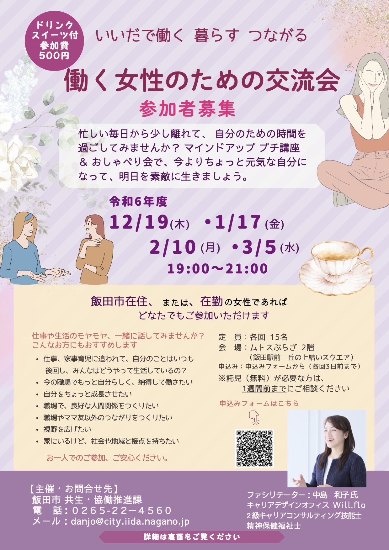 飯田市共生・協働推進課ではこのたび、ムトスぷらざ(飯田市東和町)にて女性を対象にした交流会を連続開催します。