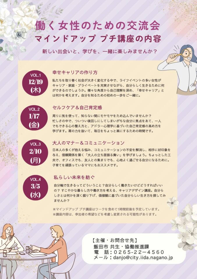 「同会は、働く女性や、育児・介護等をされている女性同士が交流し、仕事と生活の悩みや考え方を相談できるつながり作りの場。プチ講座では、今いる場所でやりがいや納得感をもち、自らの能力を発揮して誇りをもって生きていくためのヒントを学んでいただけたらと企画しています。